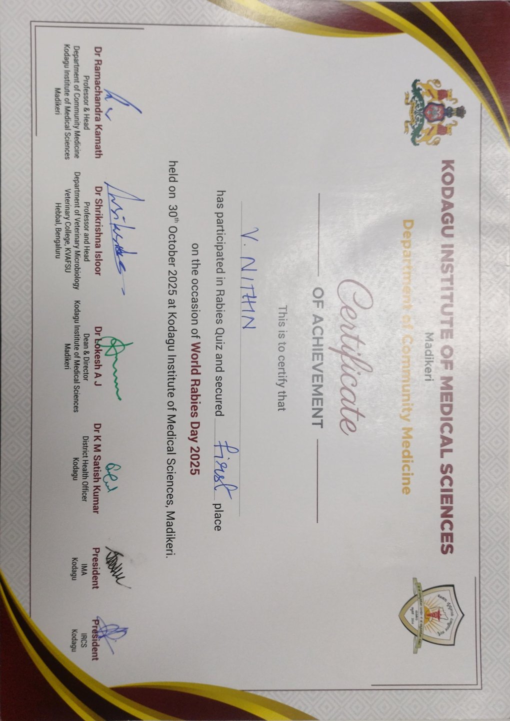 “First place” in the State level Rabies Quiz Competition held at Kodagu Institute of Medical Sciences on 30th October 2025, Dept. of Community Medicine