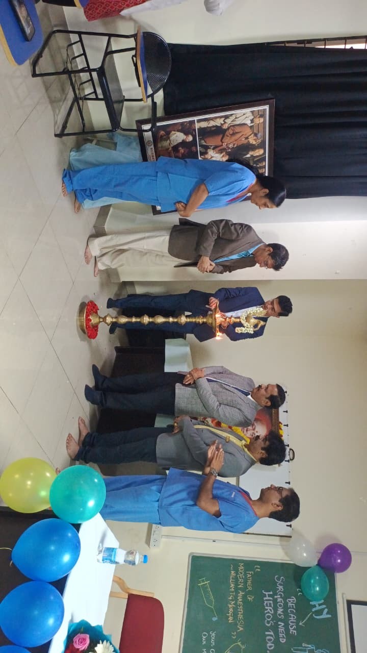The program began with an invocation song followed by a welcome address by Dr.Ramesh Kumar P B, Head of the Department of Anaesthesiology. The Chief Guest, Dr.M.E Mohan, Dean/ Principal highlighted the evolution of anaesthesia and its vital role in ensuring patient safety and comfort during surgical procedures. Dr.Srikanth Kulkarni, M.S also honoured and emphasized the importance of anaesthesiologists during surgery referring to them as SILENT HEROES for their critical role in patient care.
