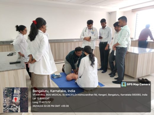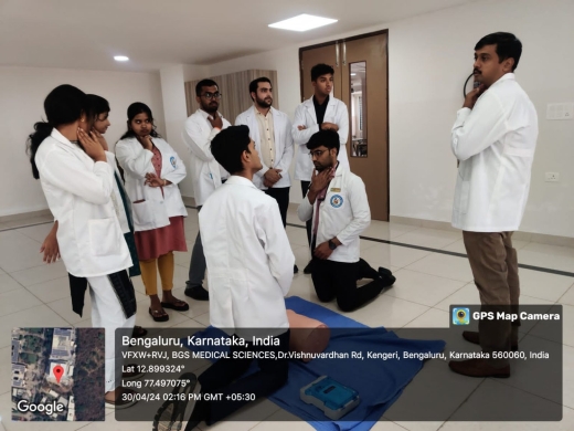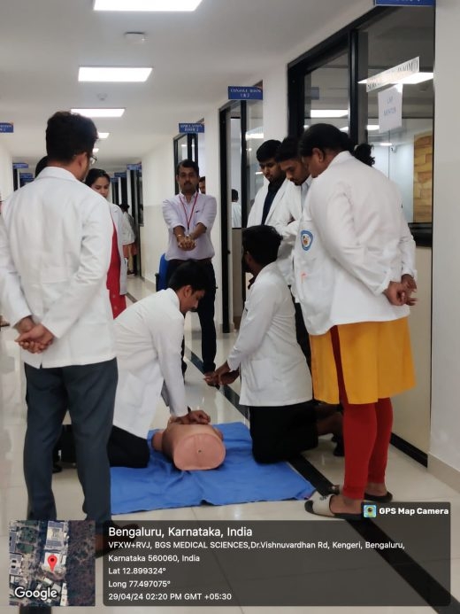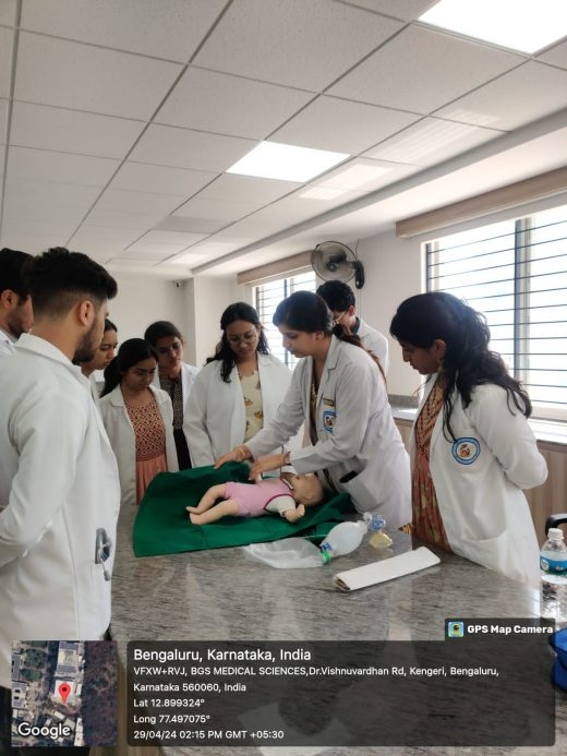 | Brief report about the Program | Under the able guidance and motivation of the Dean / Principal of BGS GIMS Dr. M E Mohan, skill lab training team conducted the two-day ECLS Training Program for interns from 29th to 30th April 2024 Training of interns starting their rotatory internship program (batch of 2019)in Basic Life Support(BLS) and emergency critical care scenarios in a day long hands on workshop.(Two batches of 65 each on 29 and 30th April 2024) Aimed at facilitating further honing of skill sets like intubation, resuscitation and high quality CPCR. This program was Trained by certified professionals using technical scenario-based teaching methodology in advanced skills laboratory. The program will help these budding doctors take clinical decisions better during emergencies. |