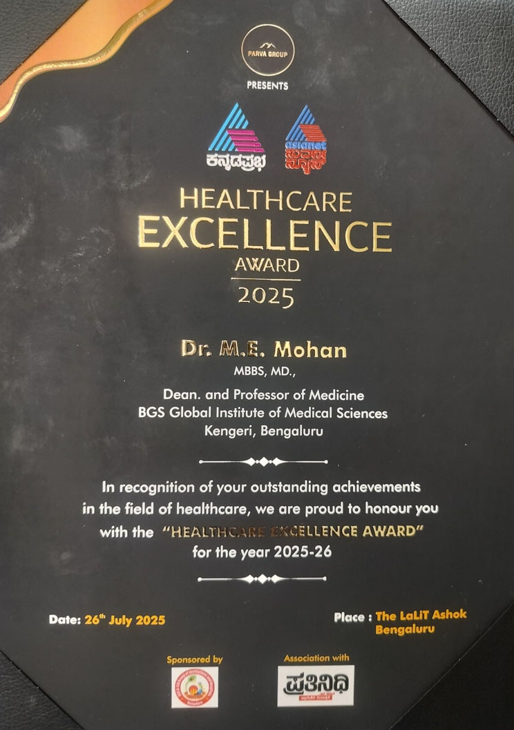 The Management, Faculty, Non-Teaching Staff and Students of BGS Global Institute of Medical Sciences, Bangalore heartily congratulate Dr. M.E. Mohan, Dean, BGSGIMS, on being honoured with the Health Care Science Award for 2025-2026 Jointly by Suvarna News and Kannada Prabha, in recognition of his outstanding achievements in the field of health care sciences.