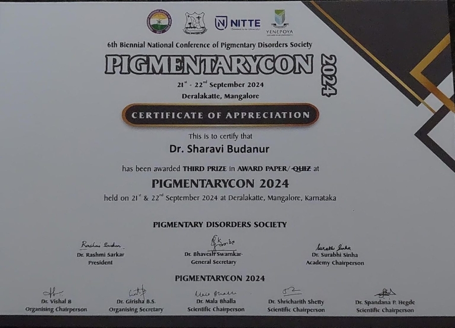 All the stake holders of the BGS Global Institute of Medical Sciences Congratulate Dr. Sharavi Budanur, 3rd year Post Graduate, Department of Dermatology, Venereology & Leprosy, BGS Global Institute of Medical Sciences for getting 3rd prize for presenting and publishing the paper entitled “Evaluation of safety and Efficacy of Yellow Peel in Periorbital Melanosis” in 6th Biennial National Conference of Pigmentary Disorders Society (PDS) of India- PIGMENTARYCON 2024 from 21-22, September 2024, at Yenepoya Medical College, Mangalore. We wish all the best for her future endeavour.