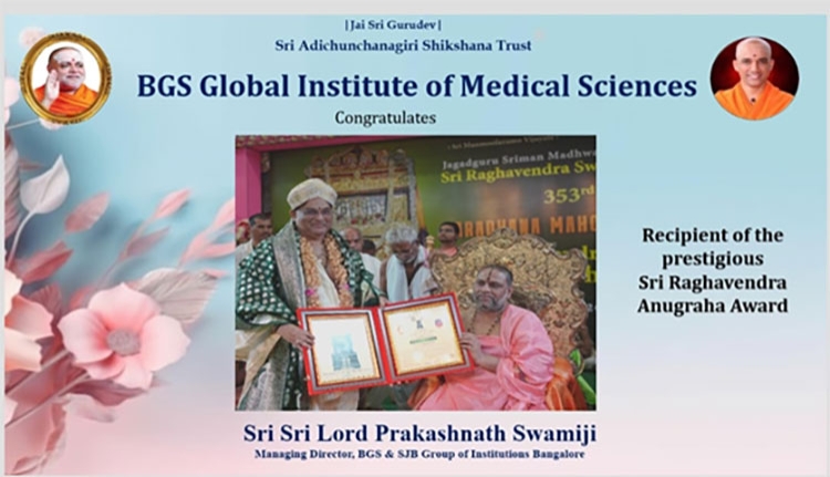 All the stake holders of BGS Global Institute of Medical Sciences Congratulate Lord Prakashnath Swamiji for Receiving the Prestigious Sri Raghavendra Anugraha Award for contribution in the field of Education. This award is honoured by His Holiness Sri Sri Subudhendra Teertha Swamiji, Head, SRS Matha in 353rd Raghavendra Swamy Aradhana Mahotsava, held on 20th August 2024 at SRS Matha, Mantralayam, Andra Pradesh, India.