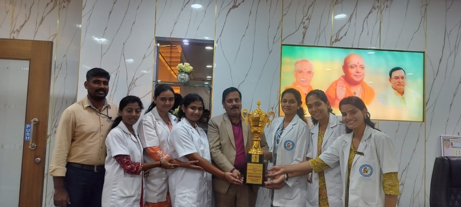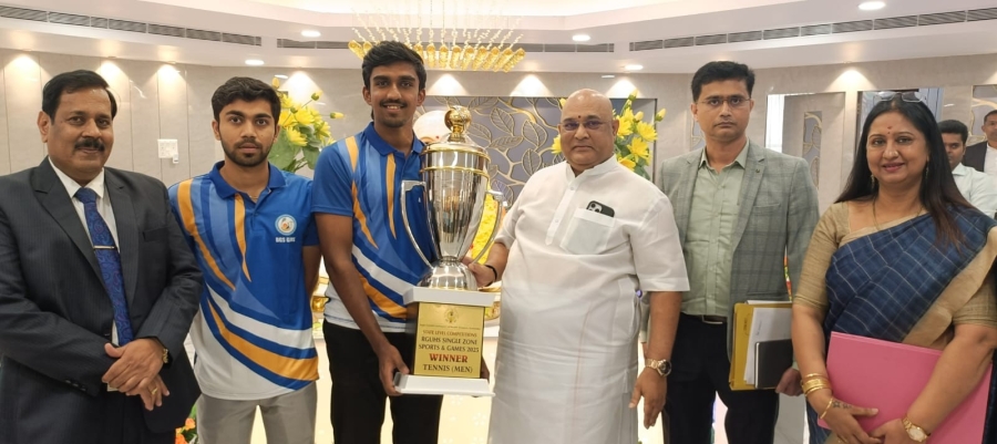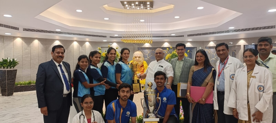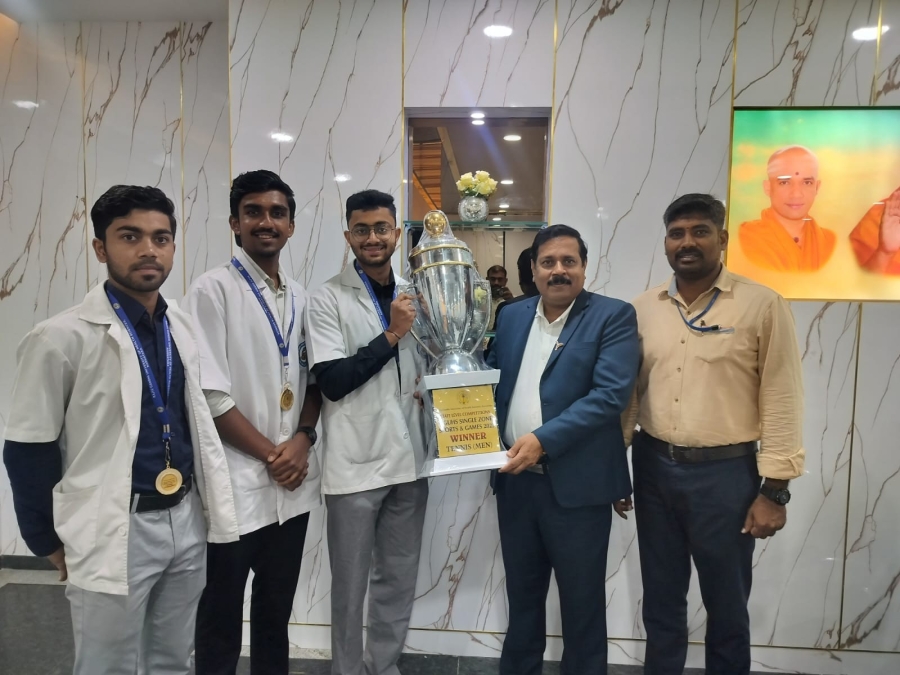 The Revered Sri Sri Dr. Prakashnath Swamiji blessed and congratulated the Dean, Physical Director, Women’s Volleyball Team, and Lawn Tennis Players for securing First Place in the RGUHS South Zone Volleyball and Tennis Tournament held in September 2025.